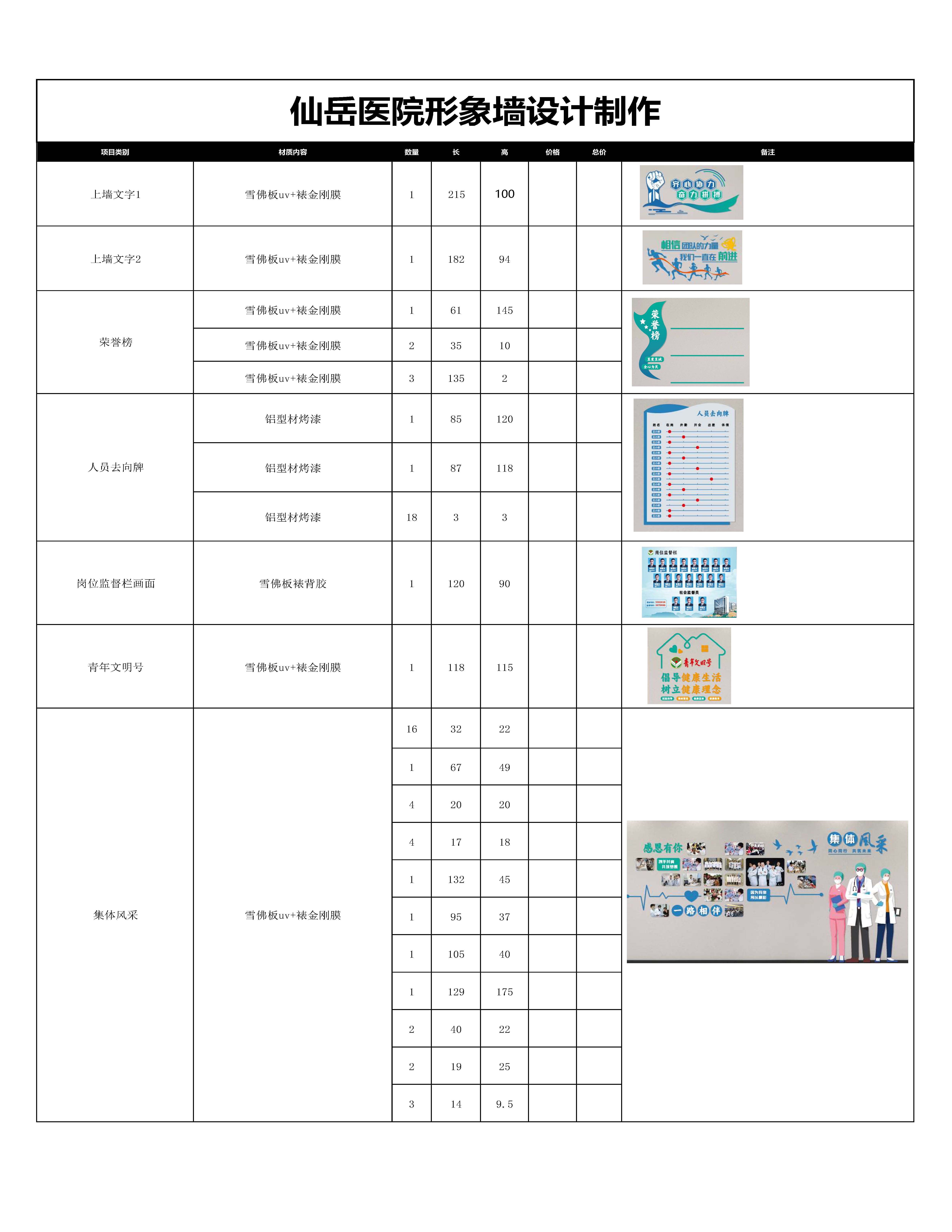 三、项目概况和招标范围: | 厦门市仙岳医院精神卫生部走廊形象墙广告制作项目,建设内容:仙岳医院形象墙广告制作(详见工程量清单),包含税费等一切费用,项目最高控制价格: 30000元。 |
